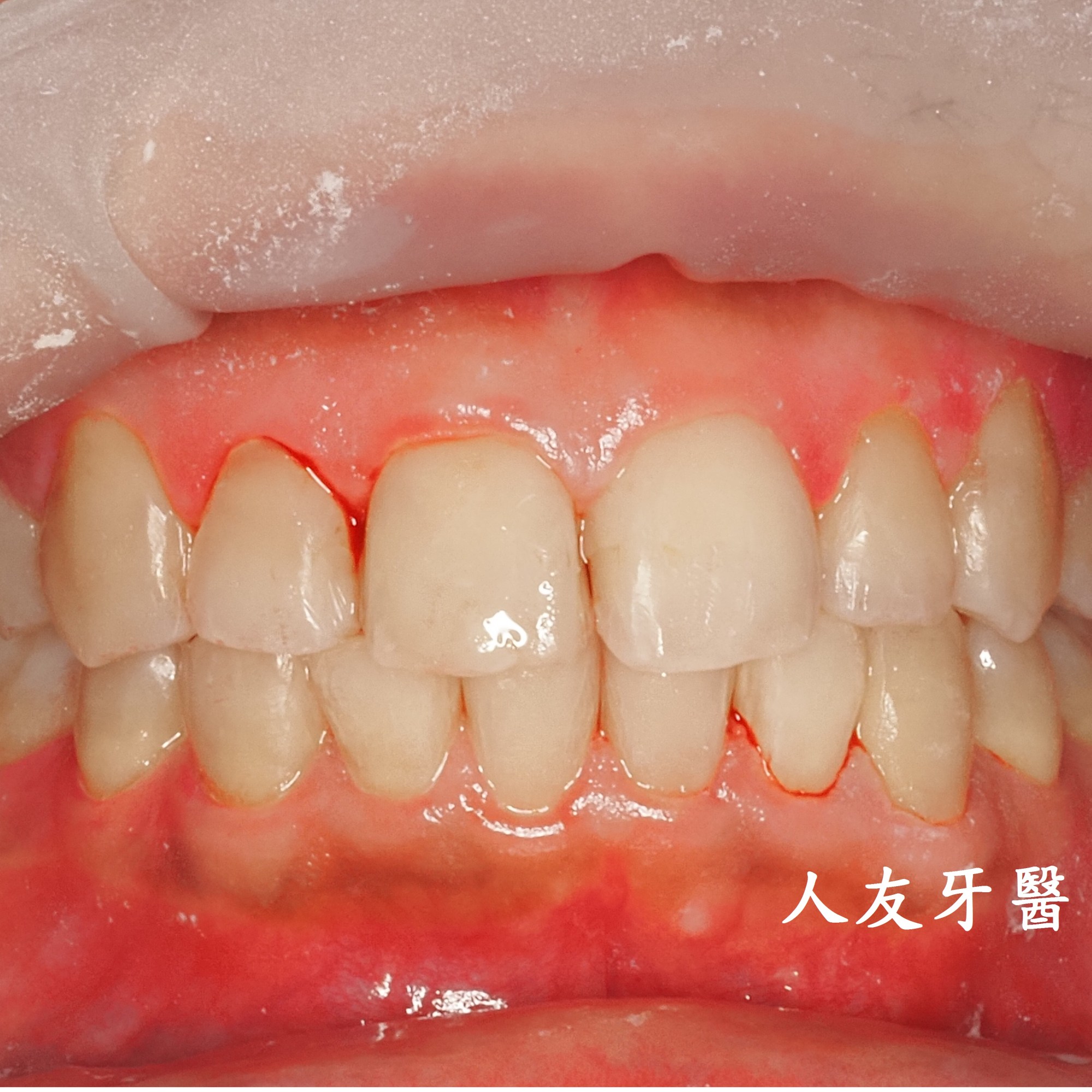 上圖紅色圓圈地方是過渡時期活動牙,門牙植入植體後,等待與骨頭密合時是缺牙的,這時候我們會讓患者有一個活動牙,讓缺牙地方有一個門面。