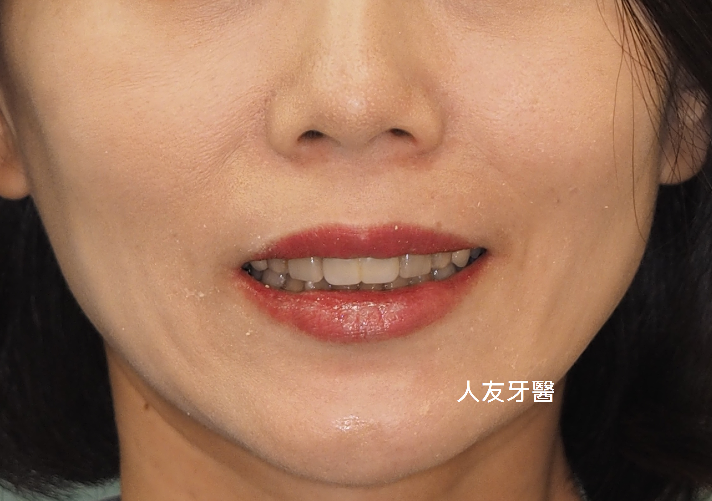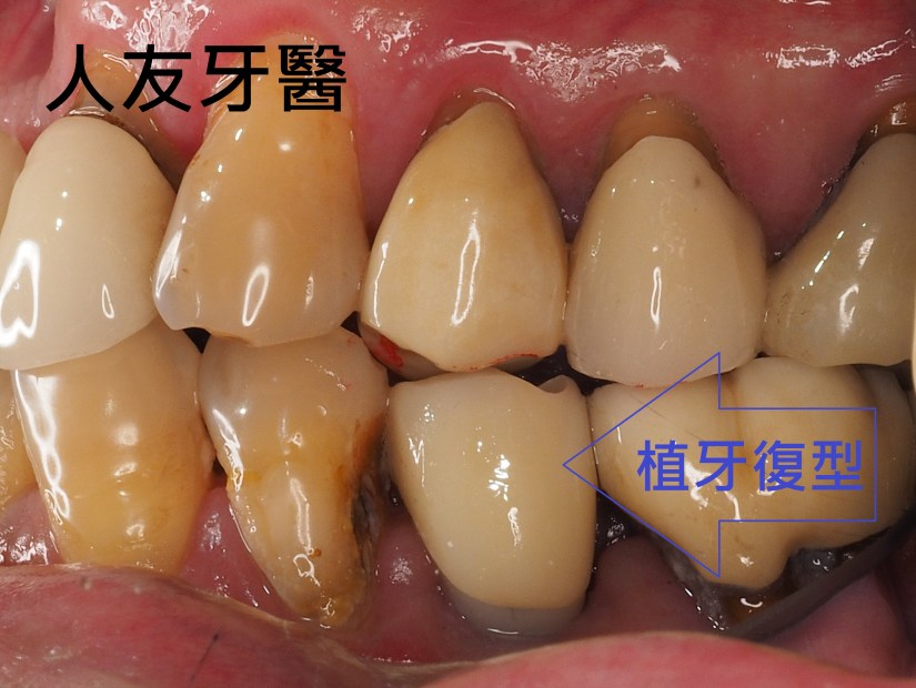 植牙完成後有幫牙套做牙肉色,牙齒才不會看起來太長。患者也不再抗拒看牙齒,說話口齒也很清晰。門面美觀又自然。