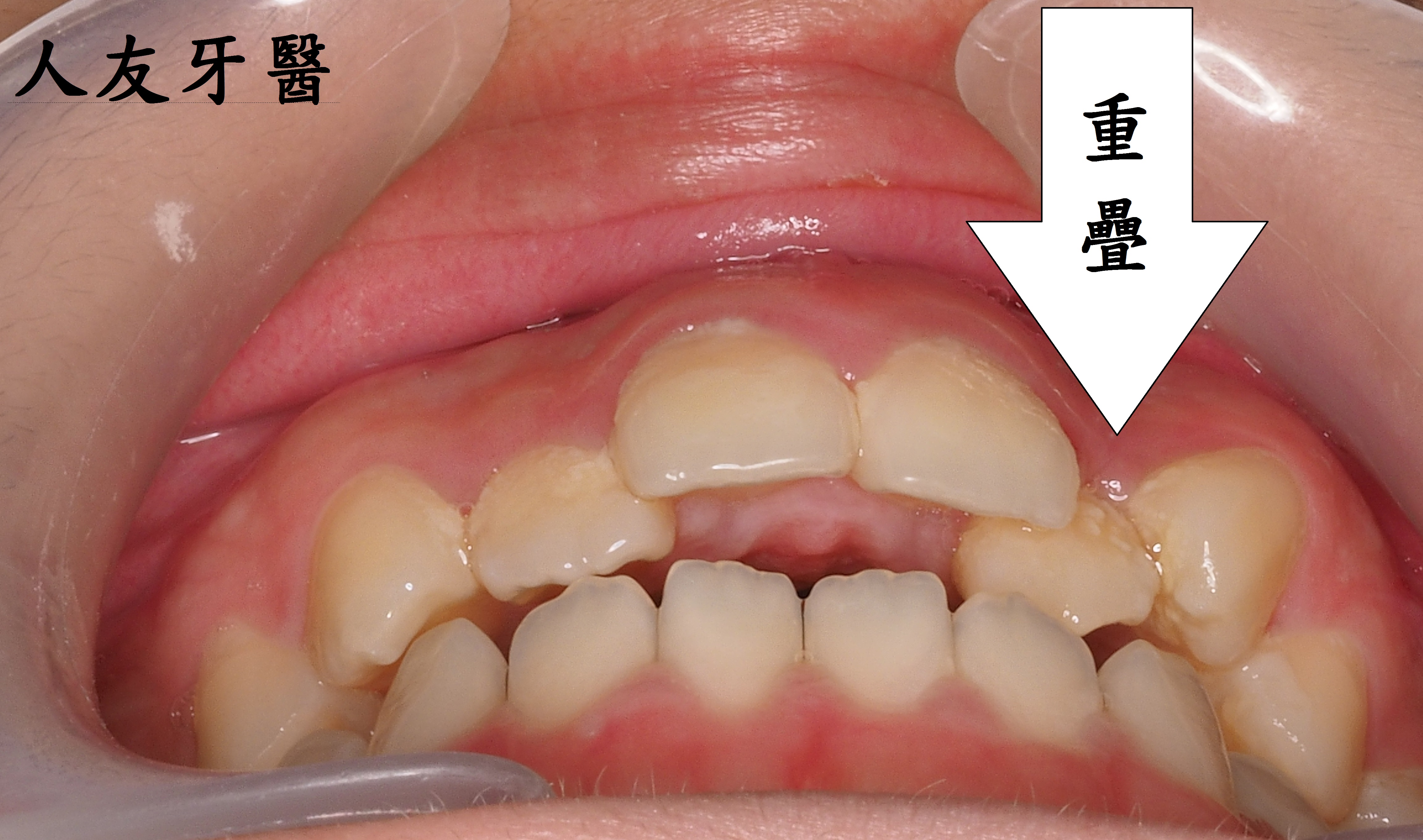 患者本身門牙開咬(前面上排牙齒沒有碰到下排牙齒),上排的側門牙與犬齒重疊,導致側門牙蛀很深,需要做根管治療,治療完,裡面放一支柱心補強,最後用牙套保護起來。醫師建議可以做矯正,把牙齒排列整齊,其他牙齒才不會再蛀牙。矯正完成後,側門牙再裝一顆正式牙套保護起來。