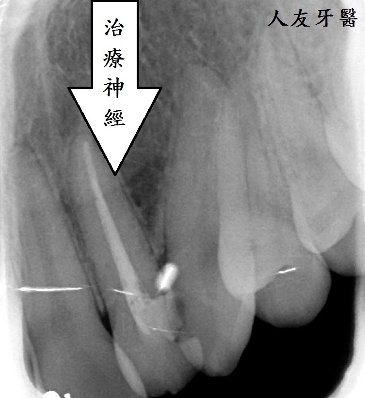 牙齒進行根管治療時,醫師會先清除牙髓及牙根管中的發炎組織,清除完並沖洗乾淨後再將牙根管填補進牙齒中,如此一來可以保留牙根,可穩固牙根,根 管治療完成後會置放一根柱心強化(下方圖)。