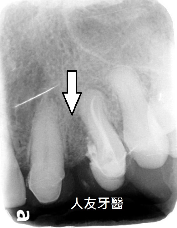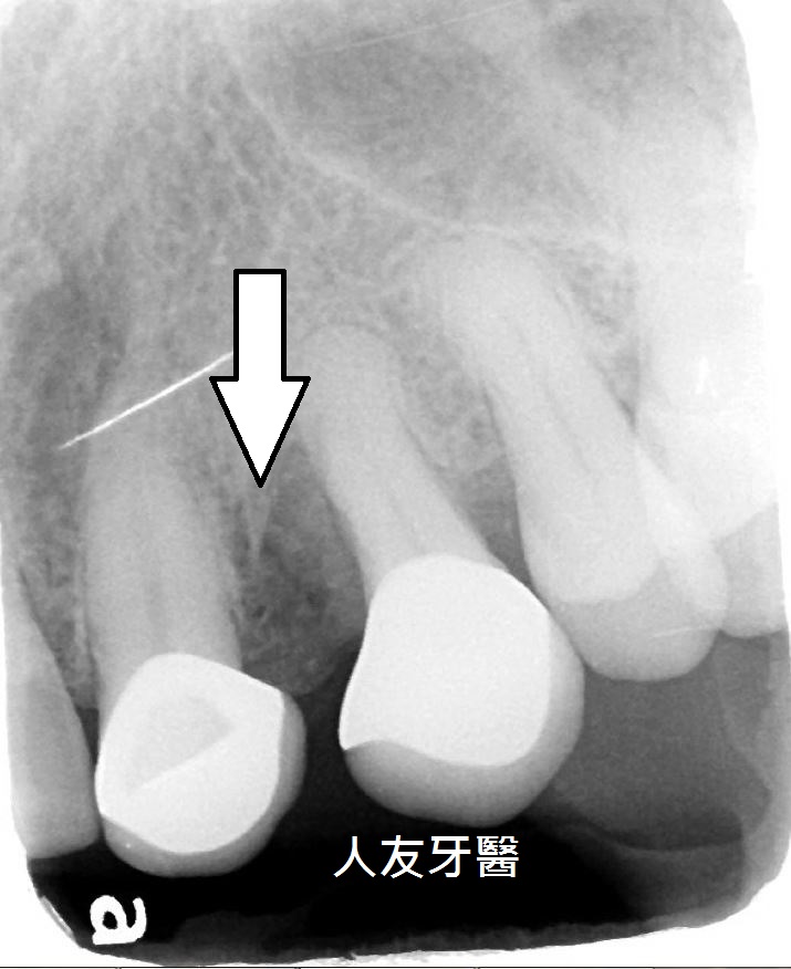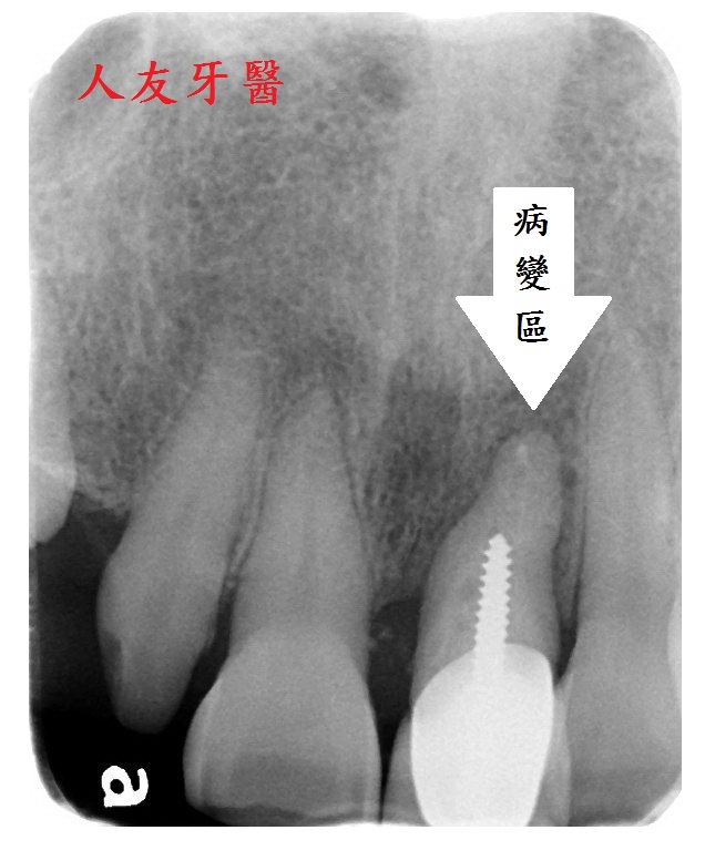 患者多年前左上正門牙因蛀牙在他院做根管治療並加裝柱心及金屬瓷牙作為膺復假牙,幾年後引發牙根囊腫,因化膿感到不適尋求本院診治