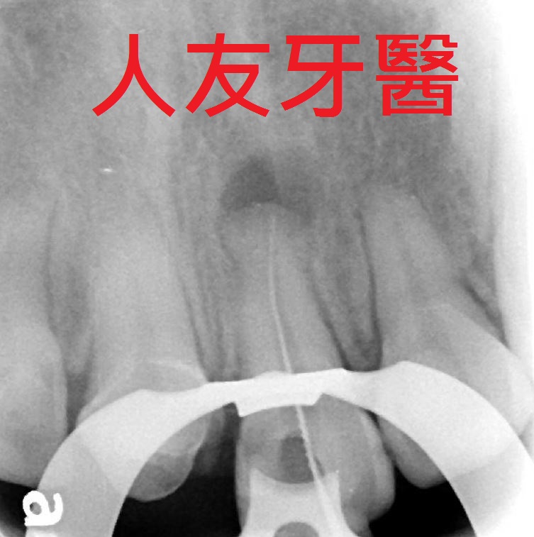 而左側門牙根尖有一個病變,醫師透過根管治療的方式把牙根深層的細菌清除乾淨,放入柱心補強,最後再搭配牙套保護.