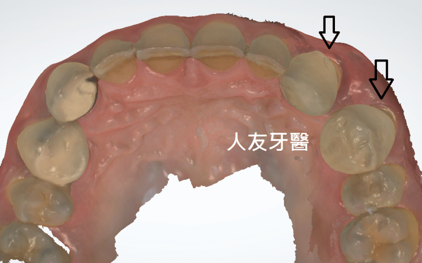 患者左上犬齒與第一小臼齒中間的縫隙很容易塞食物,牙根裸露也讓舊式牙套包覆性變得很不好。(上下圖箭頭處)