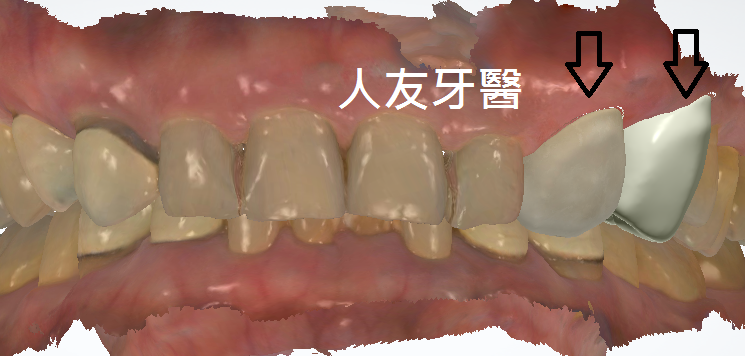 後續進行電腦掃描利用數位設計製作全鋯牙冠贗復,既美觀又自然。(下圖箭頭處)強化及恢復牙齒原來的功能及型態。