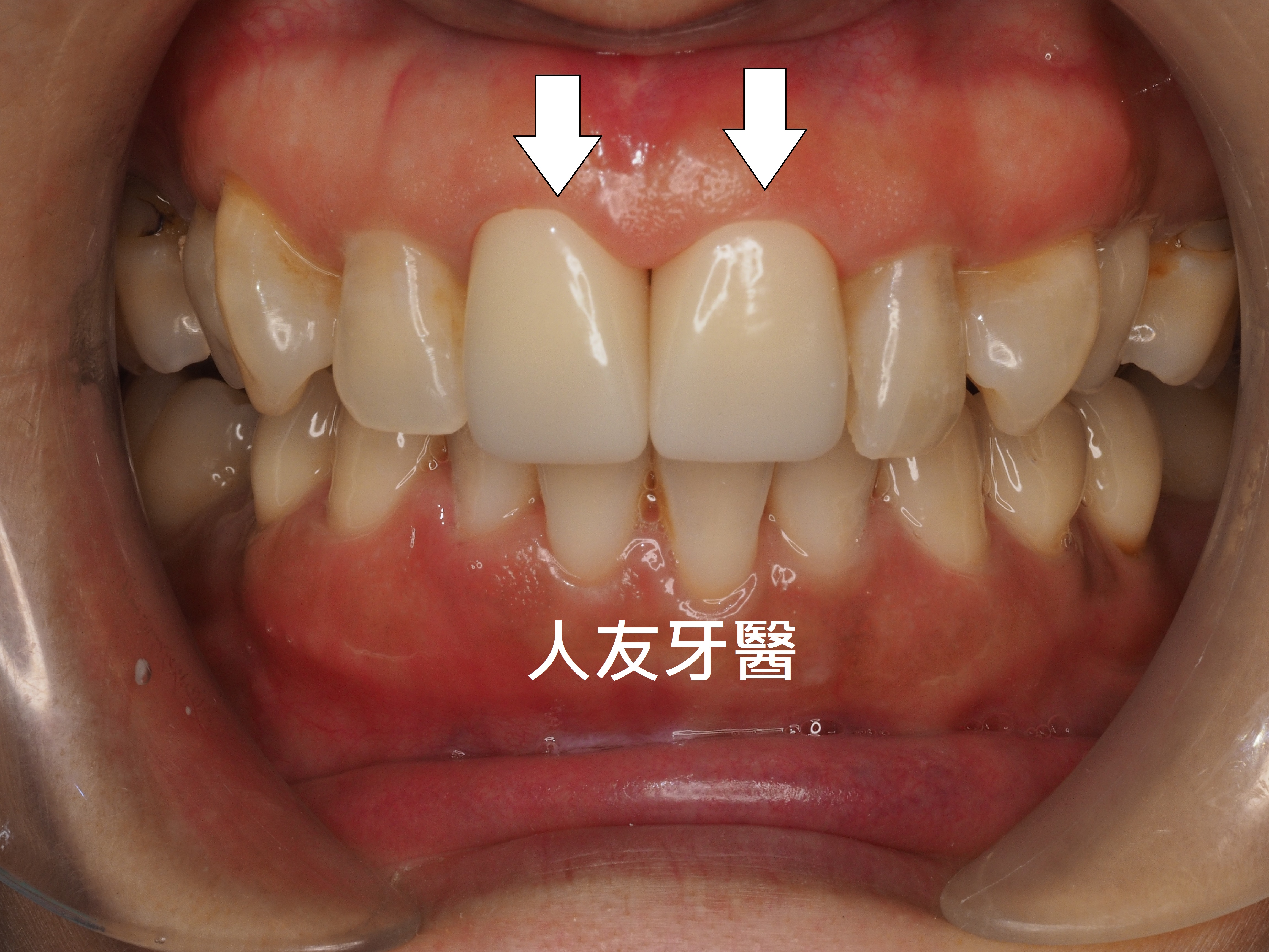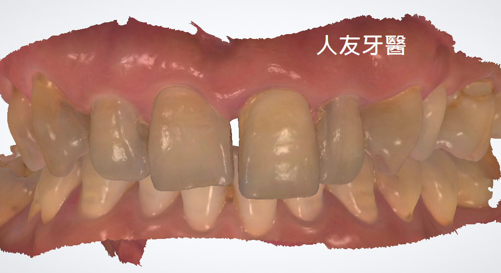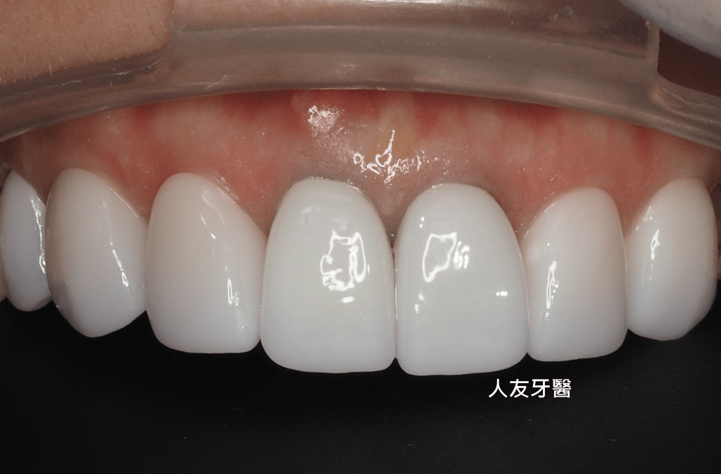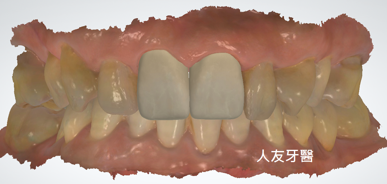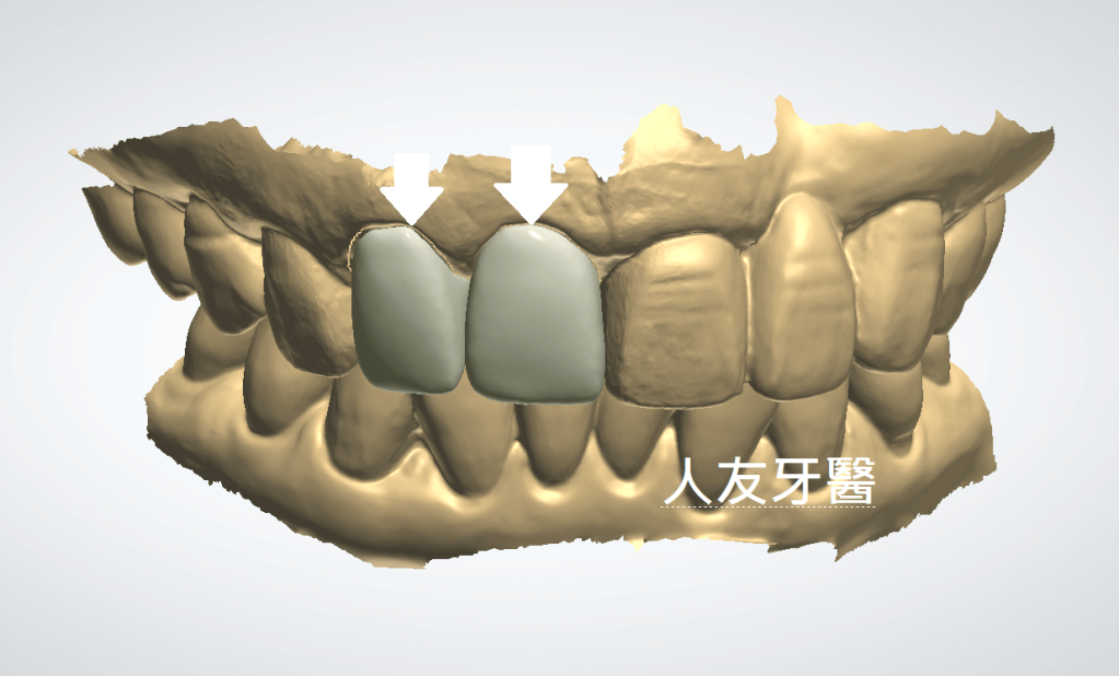 這位患者幾年前選擇陶瓷貼片改善門牙的外觀,當時覺得效果不錯,後來覺得牙色還是不夠亮白,後續回診與醫師討論後建議用全鋯牙冠來改善貼片厚度較薄,可能會造成原本的牙色透出。(下圖)