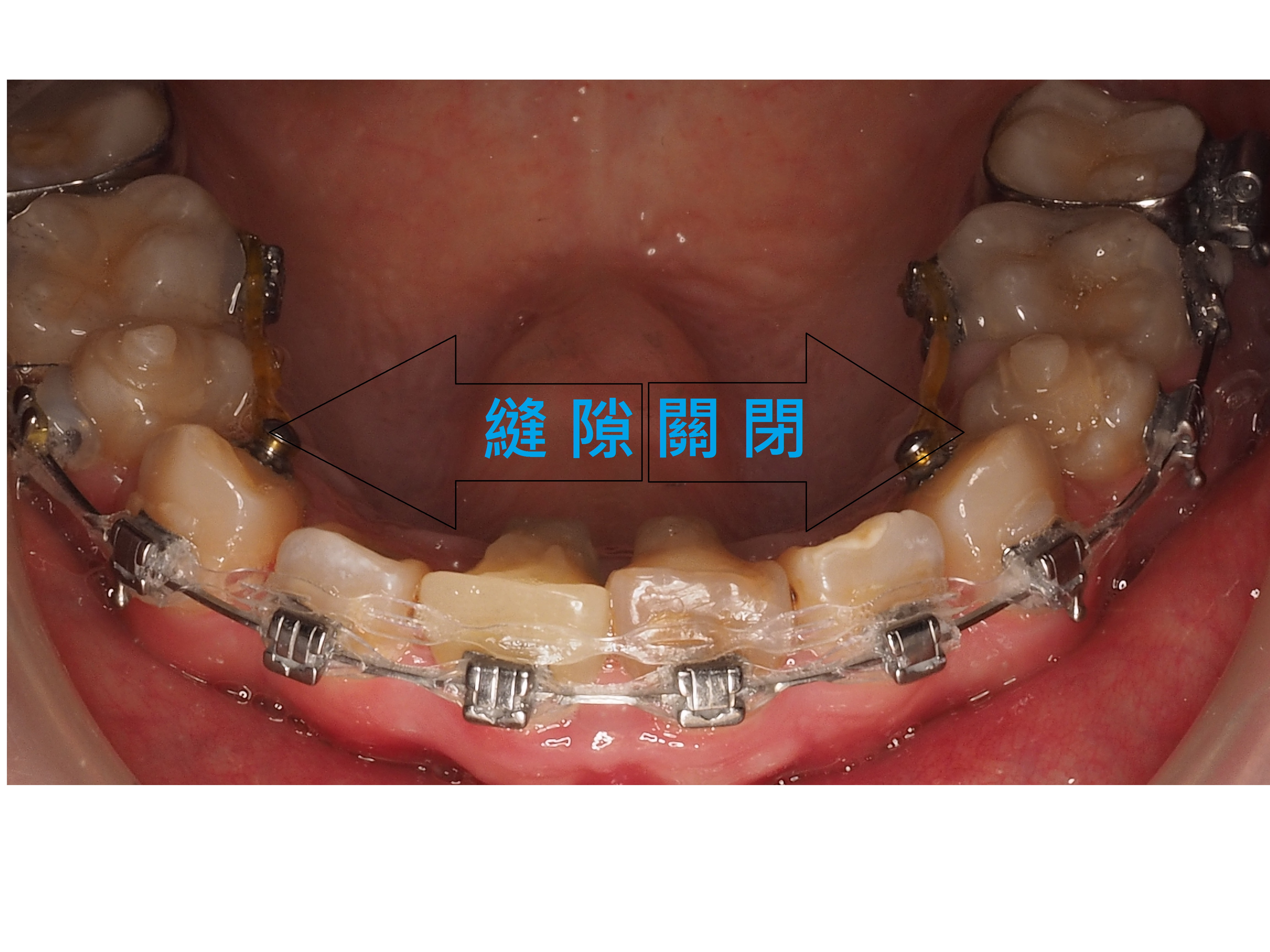 矯正過程中拔掉4顆小臼齒,透過迷你螺絲調整往後拉關縫,讓患者的嘴唇外凸獲得改善,下門牙的漏財縫也關掉了.