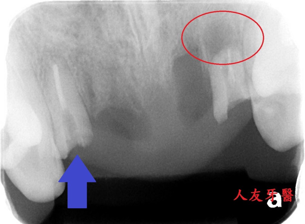想詢問周醫師如何處理。醫師看了X-RAY發現右邊側門牙紅色圓圈的地方有病變,有可能留不住。左邊側門牙藍色箭頭牙齒有裂到肉,也可能留不住。經過討論後建議都拔除。