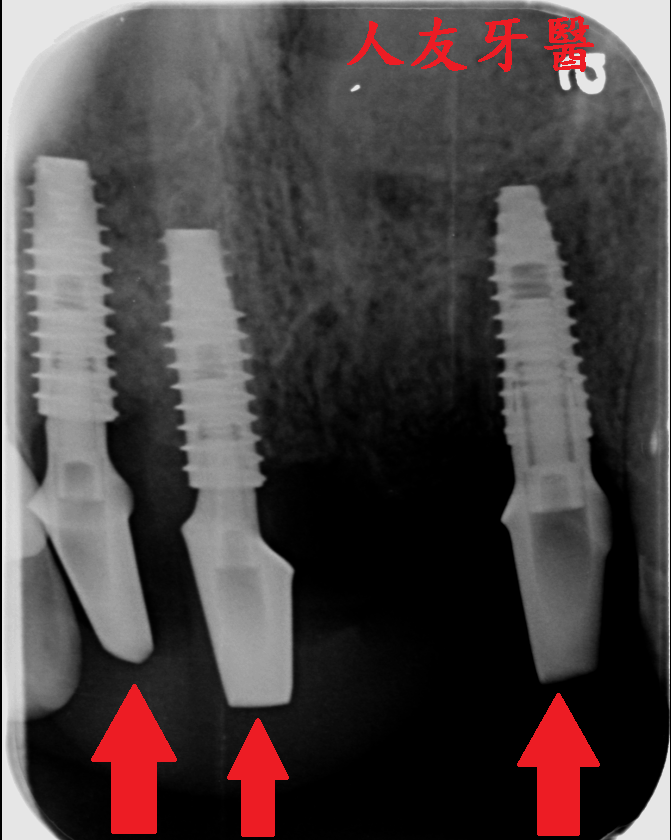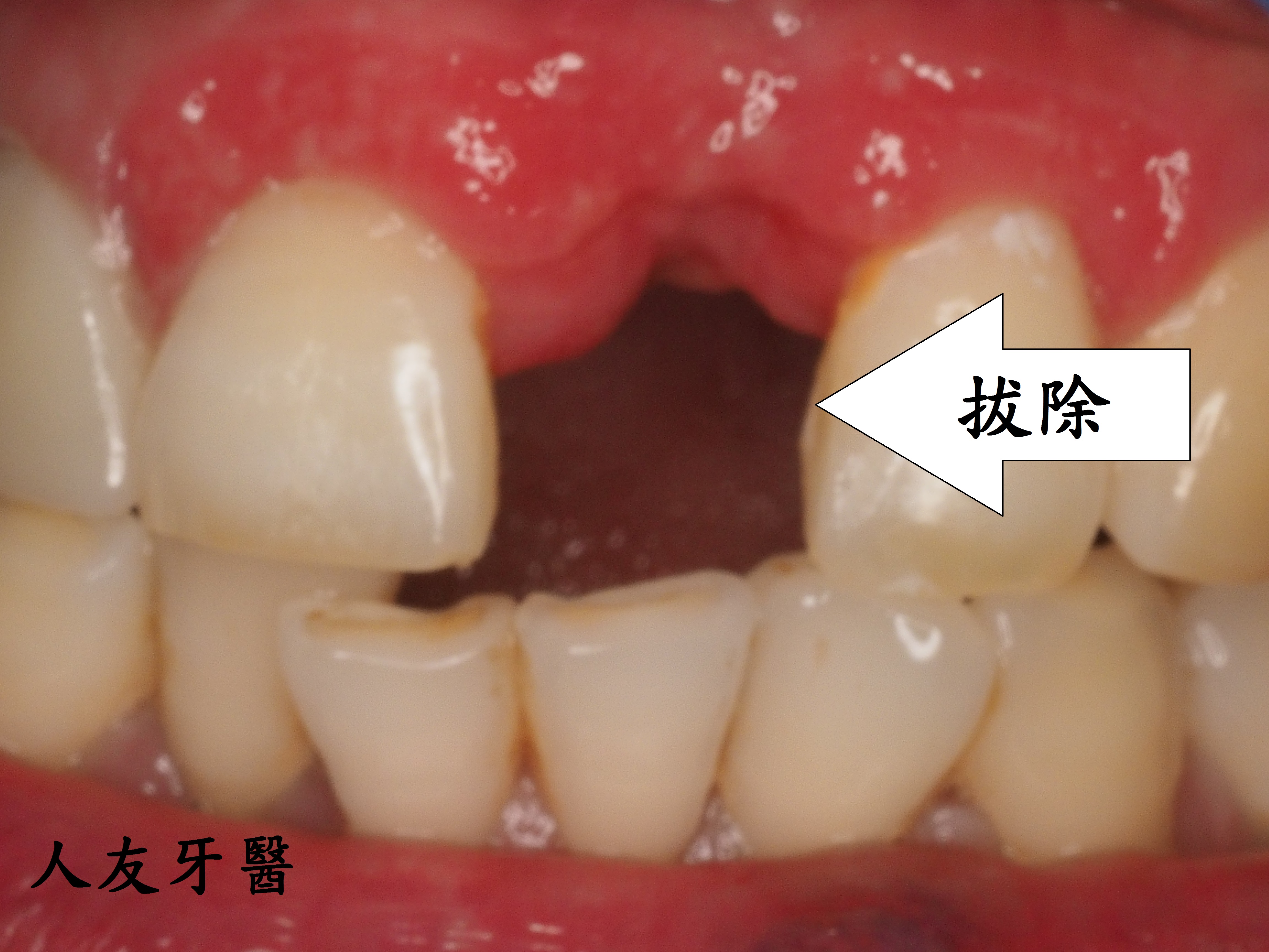 上圖紅色圓圈地方是過渡時期活動牙,門牙植入植體後,等待與骨頭密合時是缺牙的,這時候我們會讓患者有一個活動牙,讓缺牙地方有一個門面。