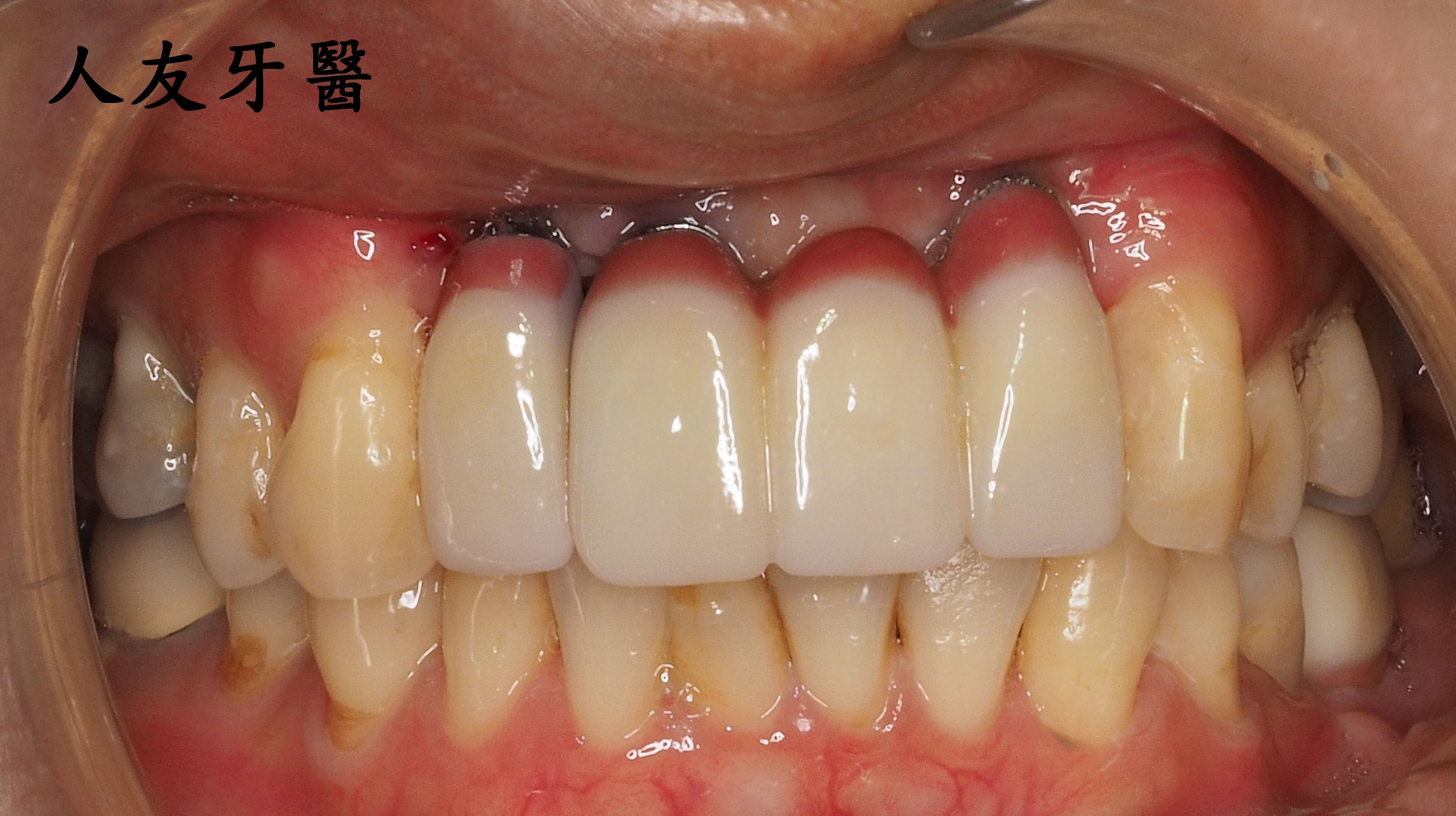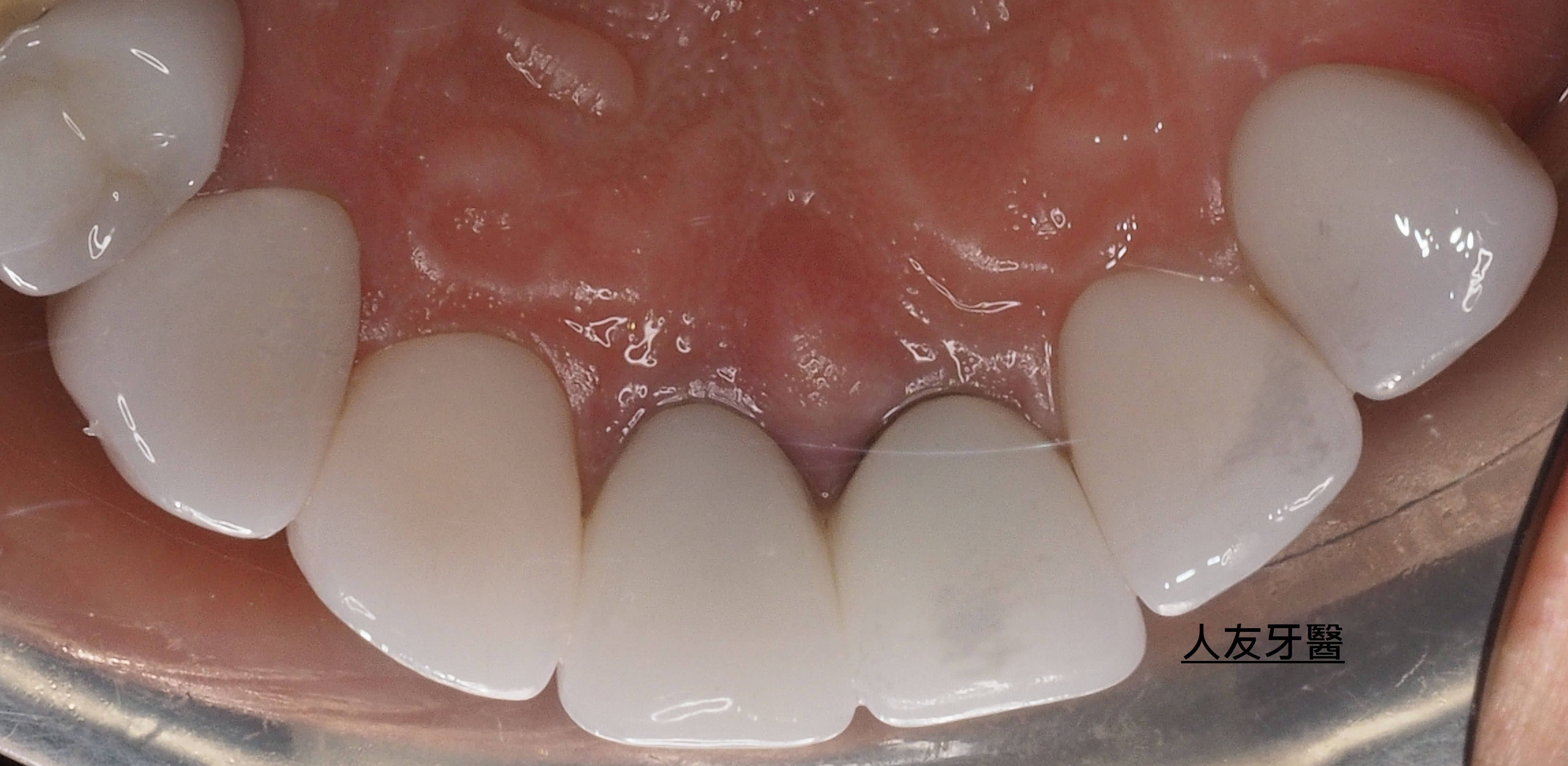 再用左邊側門牙牙套搭橋到右邊正門牙牙套(三顆相連),右邊側門牙獨立做牙套。使門面變好看,說話也不會漏風。