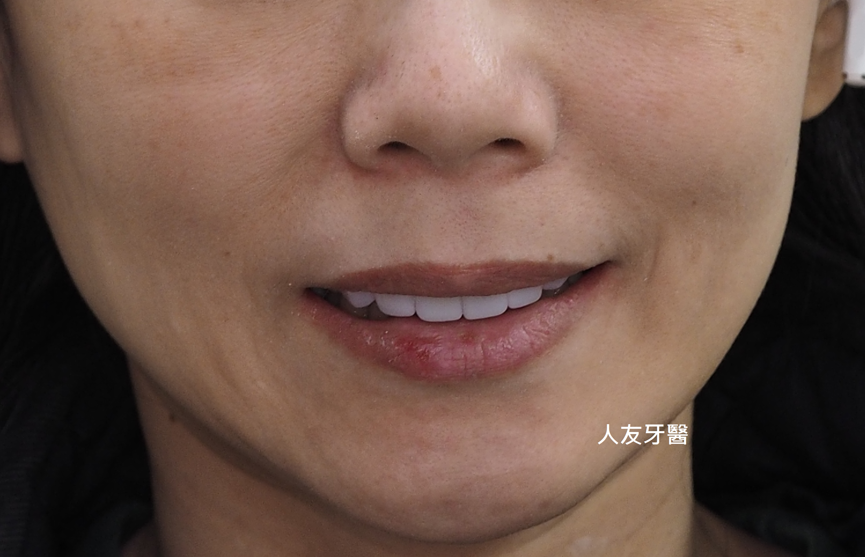 這位年輕女性患者的門牙和側門牙在別家治療半年,也有做四顆相連的牙橋,一直覺得很不舒服,笑起來不自然也不美觀,聽到鑽牙齒的聲音也很害怕。