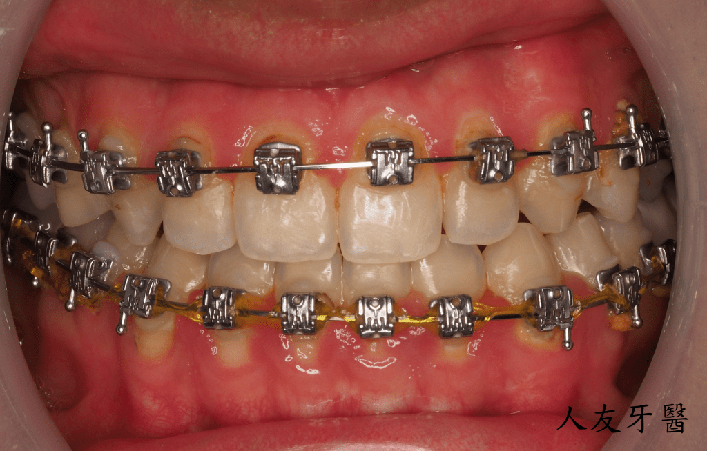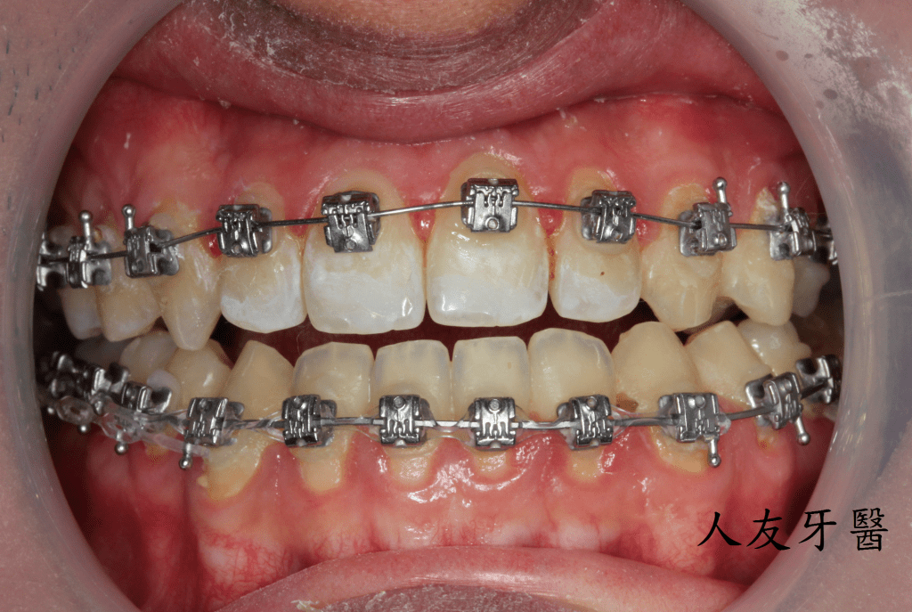 此患者矯正時間大約1年半,這過程中拔了下面左邊第一大臼齒和右邊第二大臼齒,並且也在拔牙的時候同時放置骨釘在兩側加速下顎牙齒移動的速度。然而在矯正過程也把下面左邊第一大臼齒利用植牙的方式重建起來。