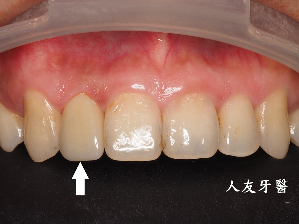 患者右上第二小臼齒缺牙,多年前製作的金屬牙橋密合度越來越不好,造成第一大臼齒牙根裸露,也常常覺得牙齦不舒服。