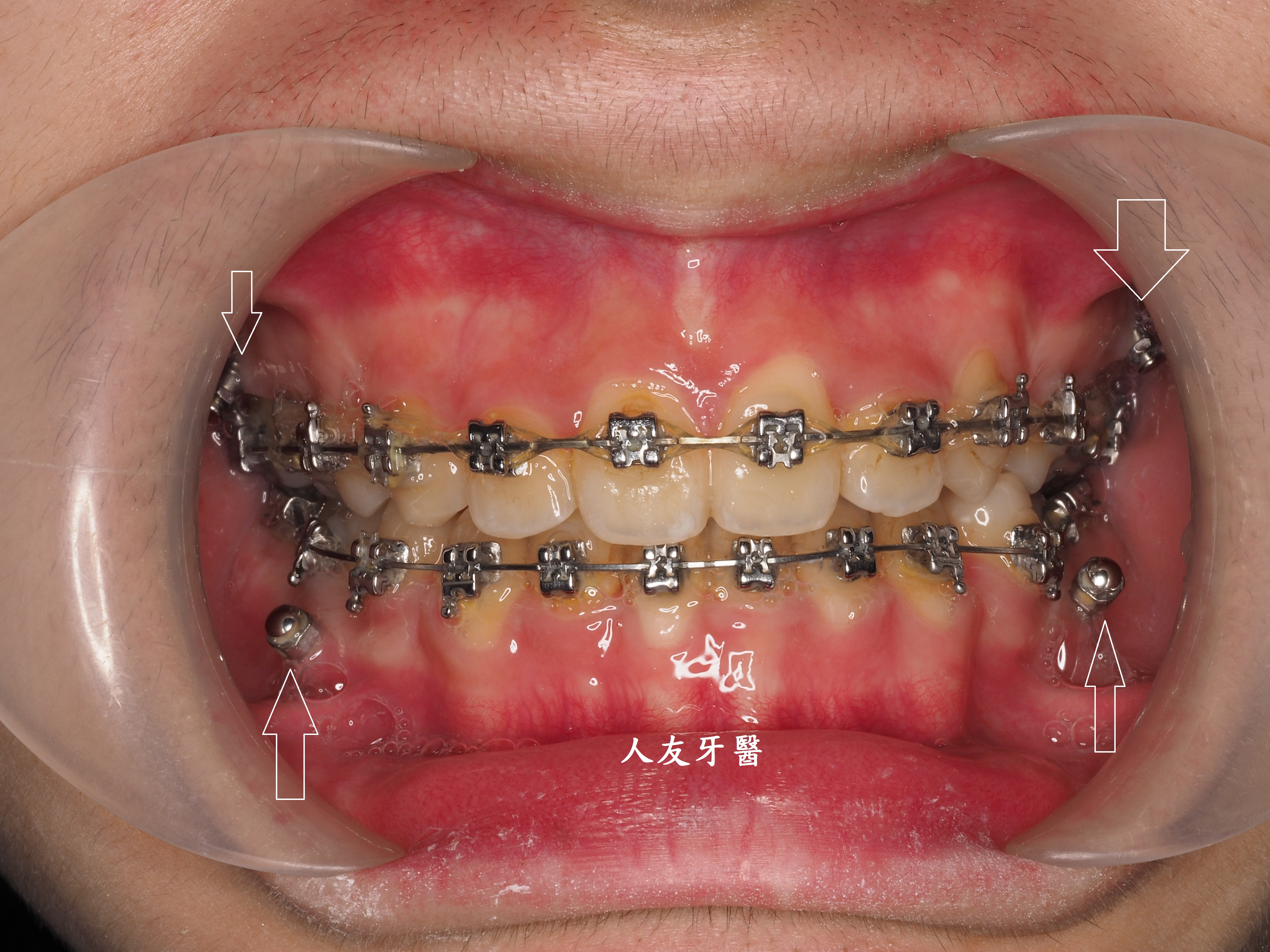 3.拔牙與骨釘:為騰出空間進行矯正,需要拔牙;骨釘用於輔助移動牙齒,初期可能會有異物感,但通常很快能適應。(下兩圖)